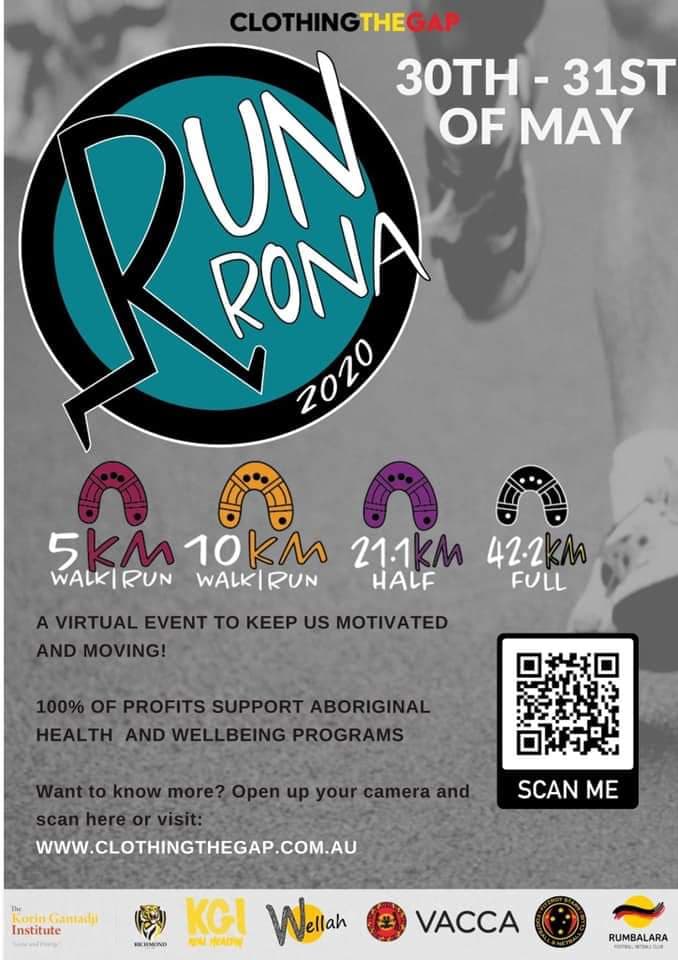 RunRona 2020 is a virtual walk created by Clothing the Gap in lieu of the real one as it was cancelled due to Covid19 restrictions. If you’re interested, you can find out more details here: https://clothingthegap.com.au/pages/run-rona.
